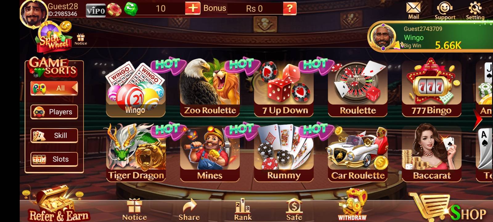 Starting the game is easy. Players can log in as a guest with one tap. A guest account is instantly created with a unique ID. For better account safety and full features like withdrawals, users can bind their account using their mobile number and email.