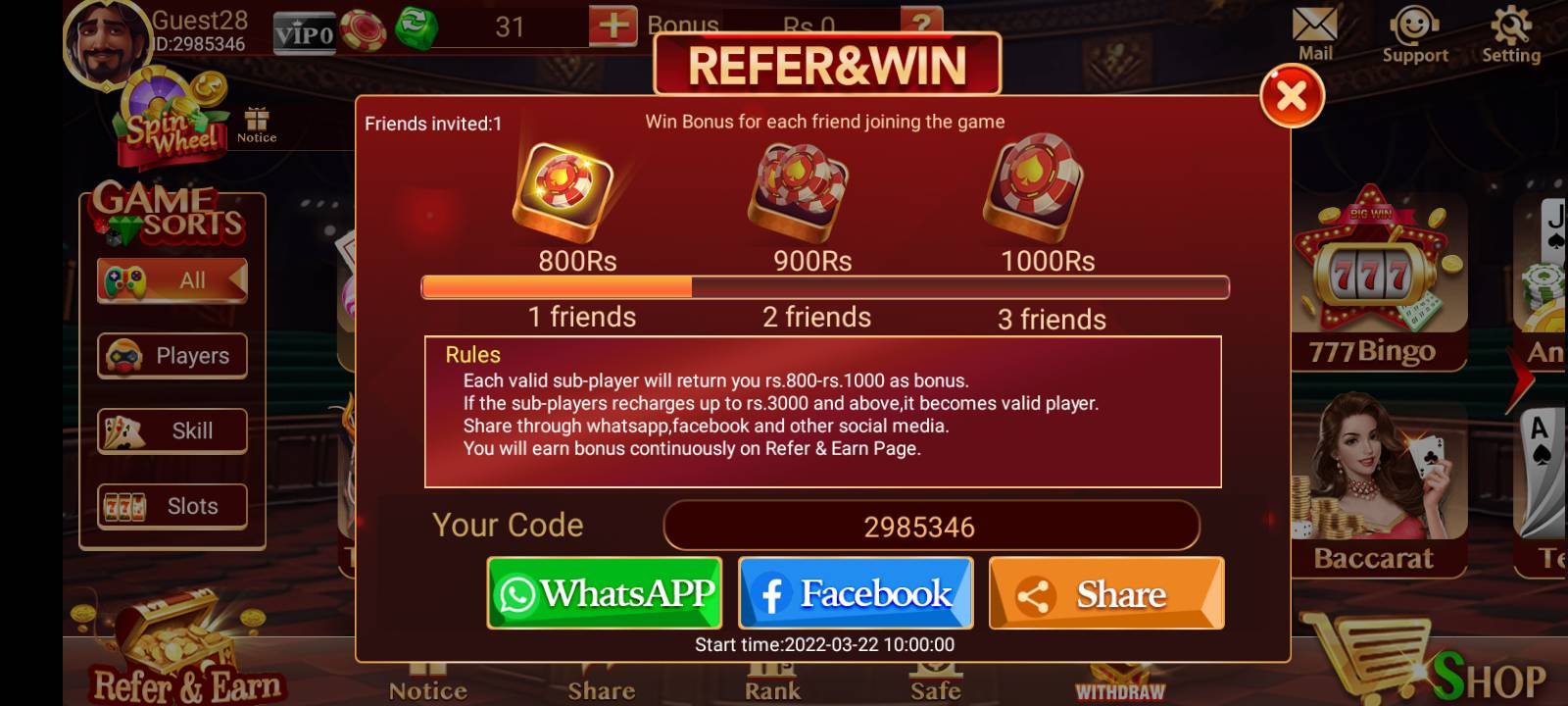 The referral system is one of the easiest ways to earn money without playing. Share your referral code with friends, and you’ll earn a commission whenever they deposit money. The more people you refer, the more you can earn passively.