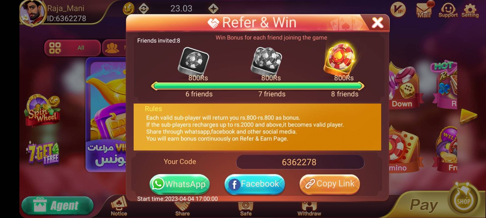 The app has one of the most generous referral systems in the online gaming world. You can share your referral link with friends and family. When someone signs up and starts playing, you get a commission. If you refer more users, your income increases through different levels.