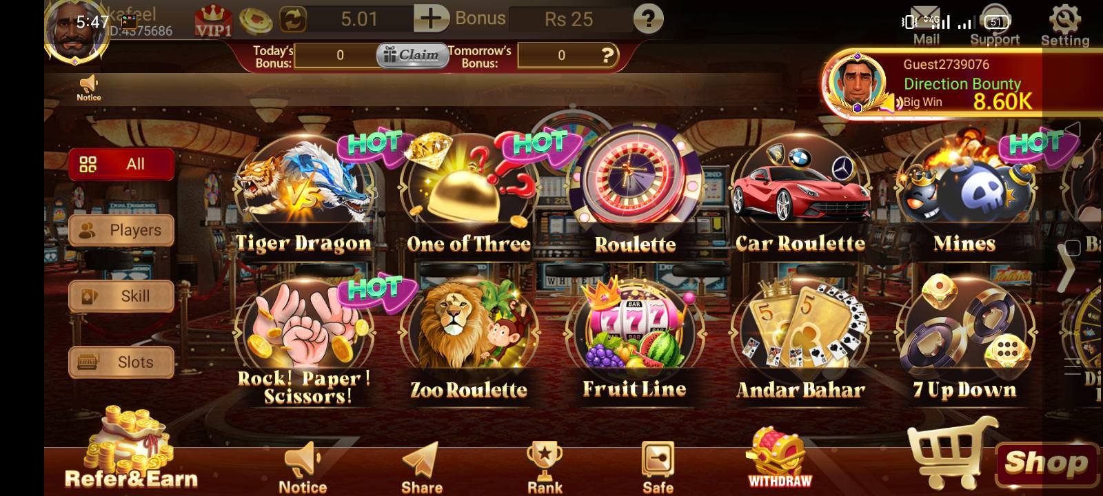 Earn real money by winning games, joining events, or completing daily missions. You can play for free, win chips, and convert them into real cash.