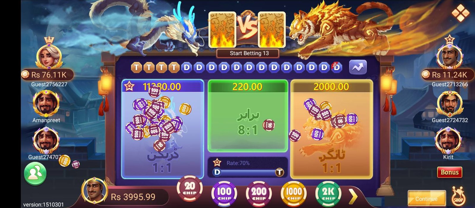 Choose which side—Dragon or Tiger—will draw the higher card. It’s a fast and thrilling game of chance.